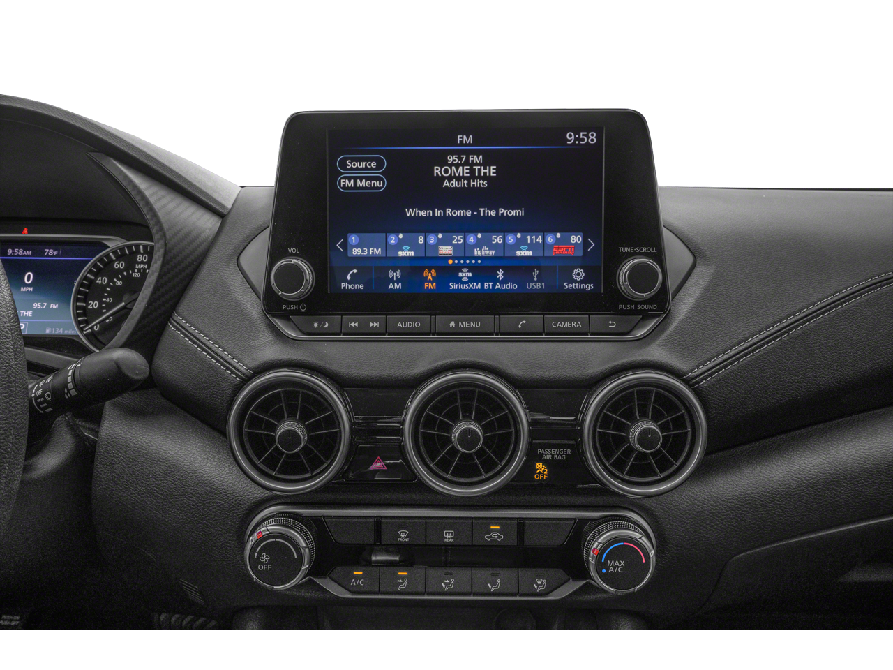 - Radio: AM/FM w/RDS/MP3/Aux-In -inc: 6 speakers plus 2 tweeters in A-pillar, 8" color display w/multi-touch control, streaming audio via Bluetooth®, Bluetooth® hands-free phone system, hands-free text messaging assistant, Siri Eyes Free, Google Assistant voice recognition w/Apple CarPlay and Android Auto, NissanConnect, (1) front USB connection port (type A), (1) additional front USB (type C), (1) charge-only USB (type A) center console and SiriusXM radio w/advanced audio features